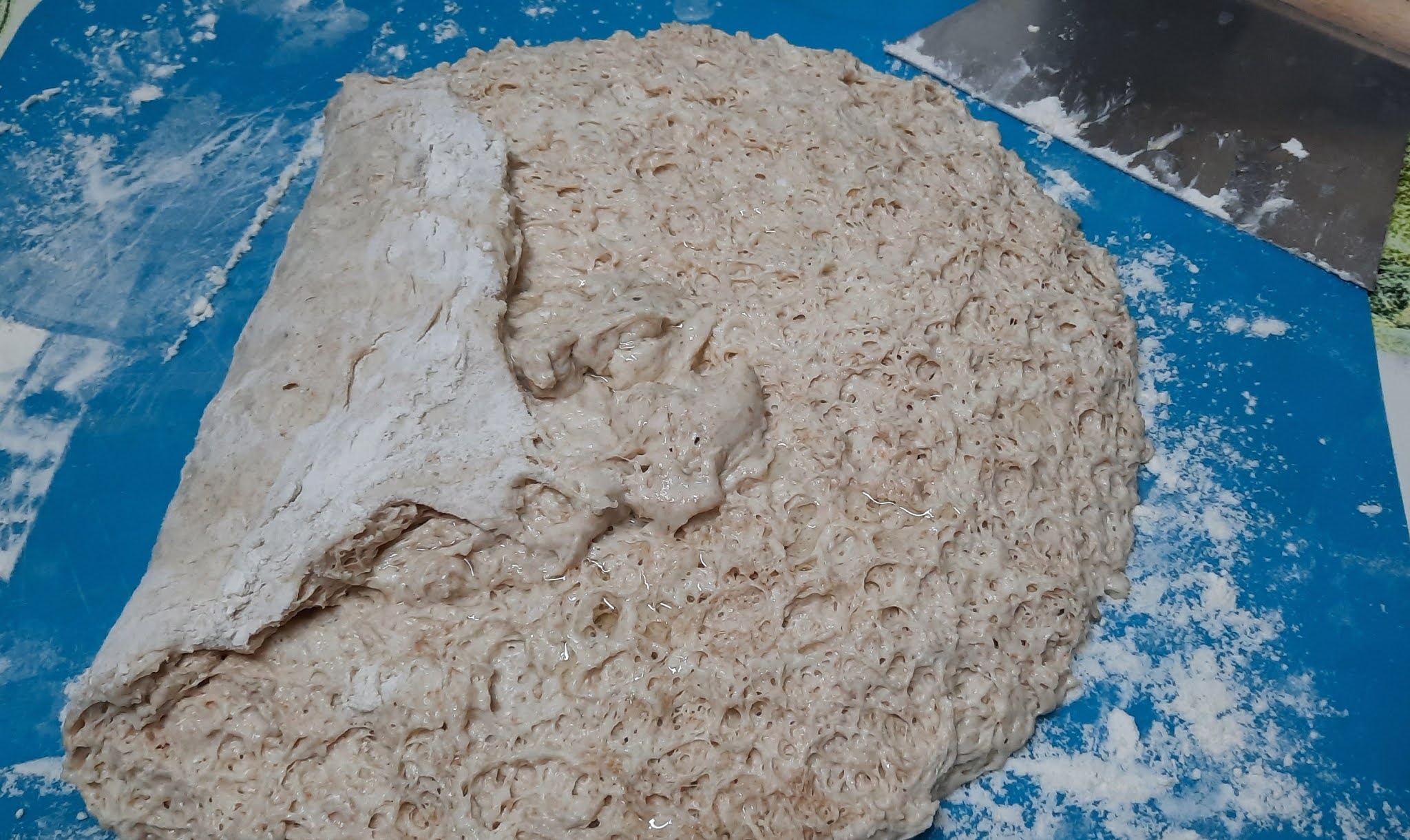 Po 8 godzinach: stolnicę oprósz mąką uniwersalną. Miskę z wyrośniętym ciastem obrócić o 180 stopni i pozwolić, aby ciasto samo wypadło z miski. Resztę ciasta, które ewentualnie pozostanie w misce, wyjąć przy pomocy łyżki.